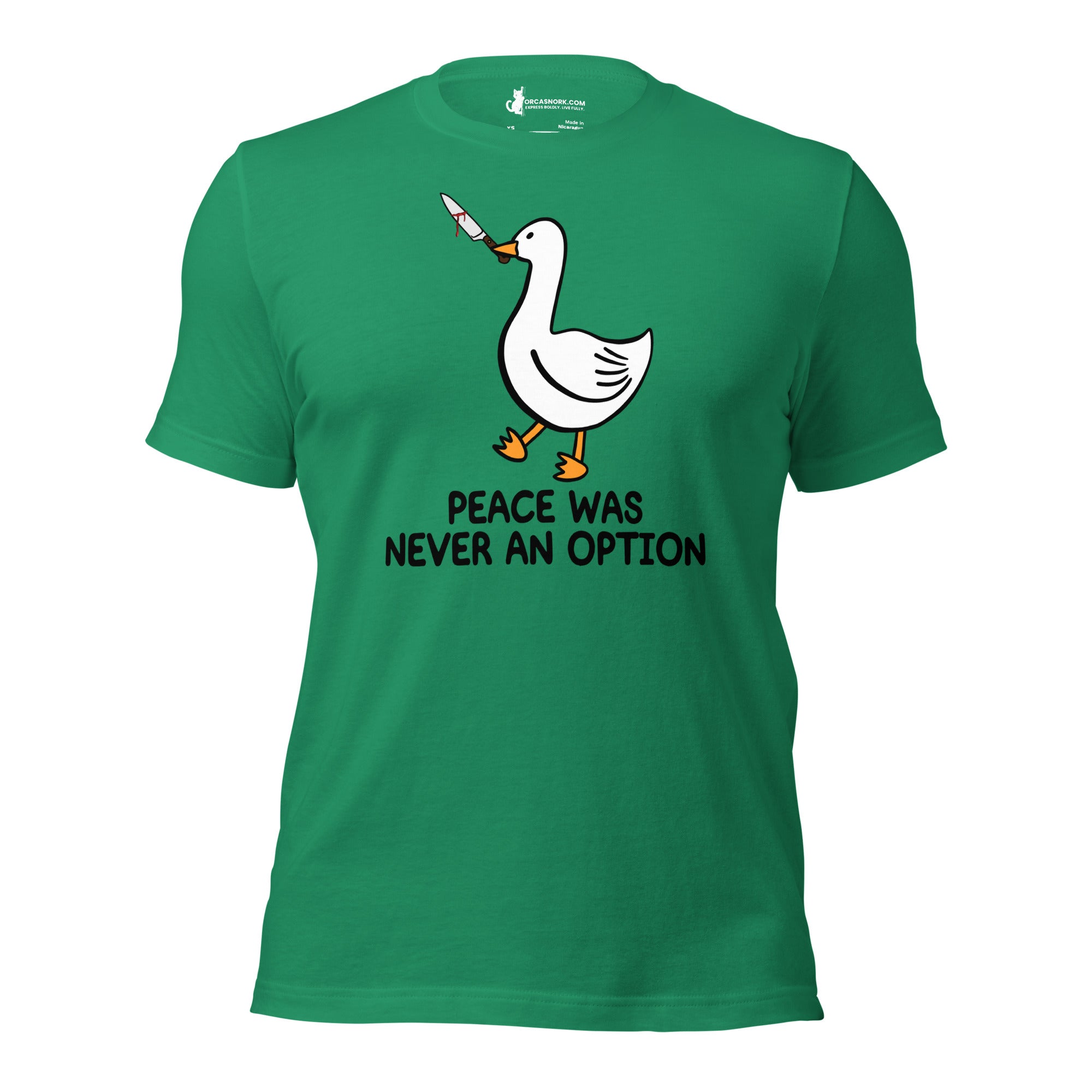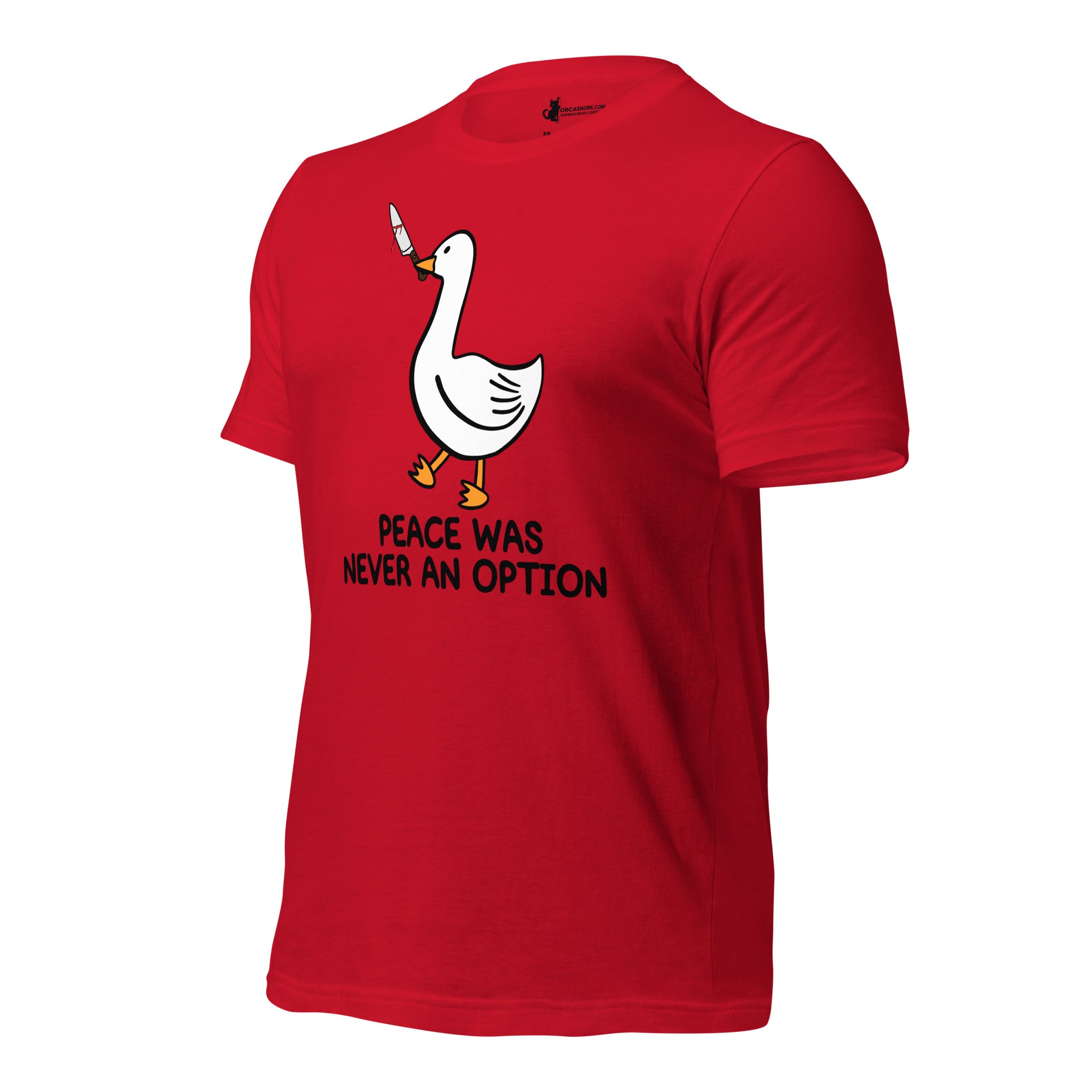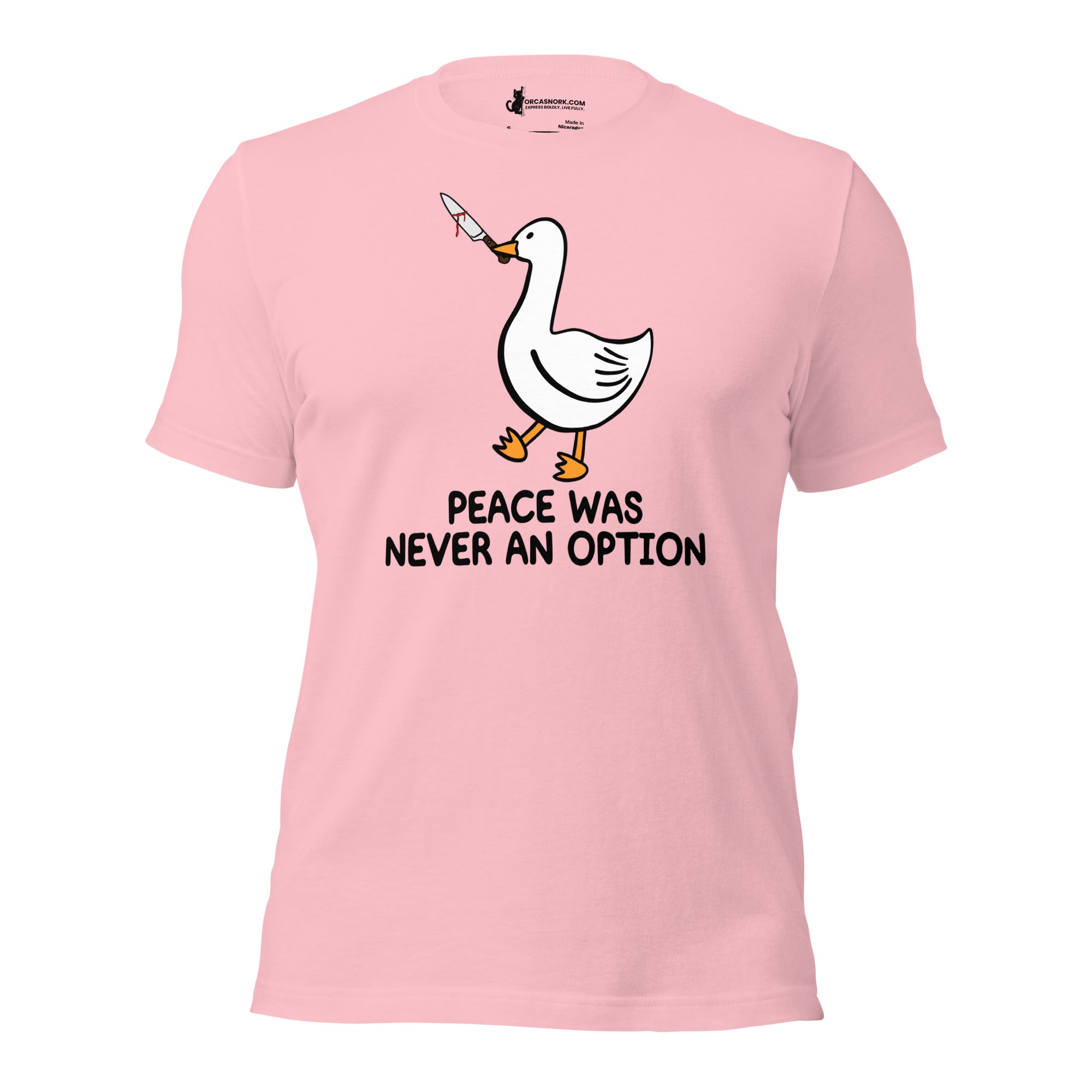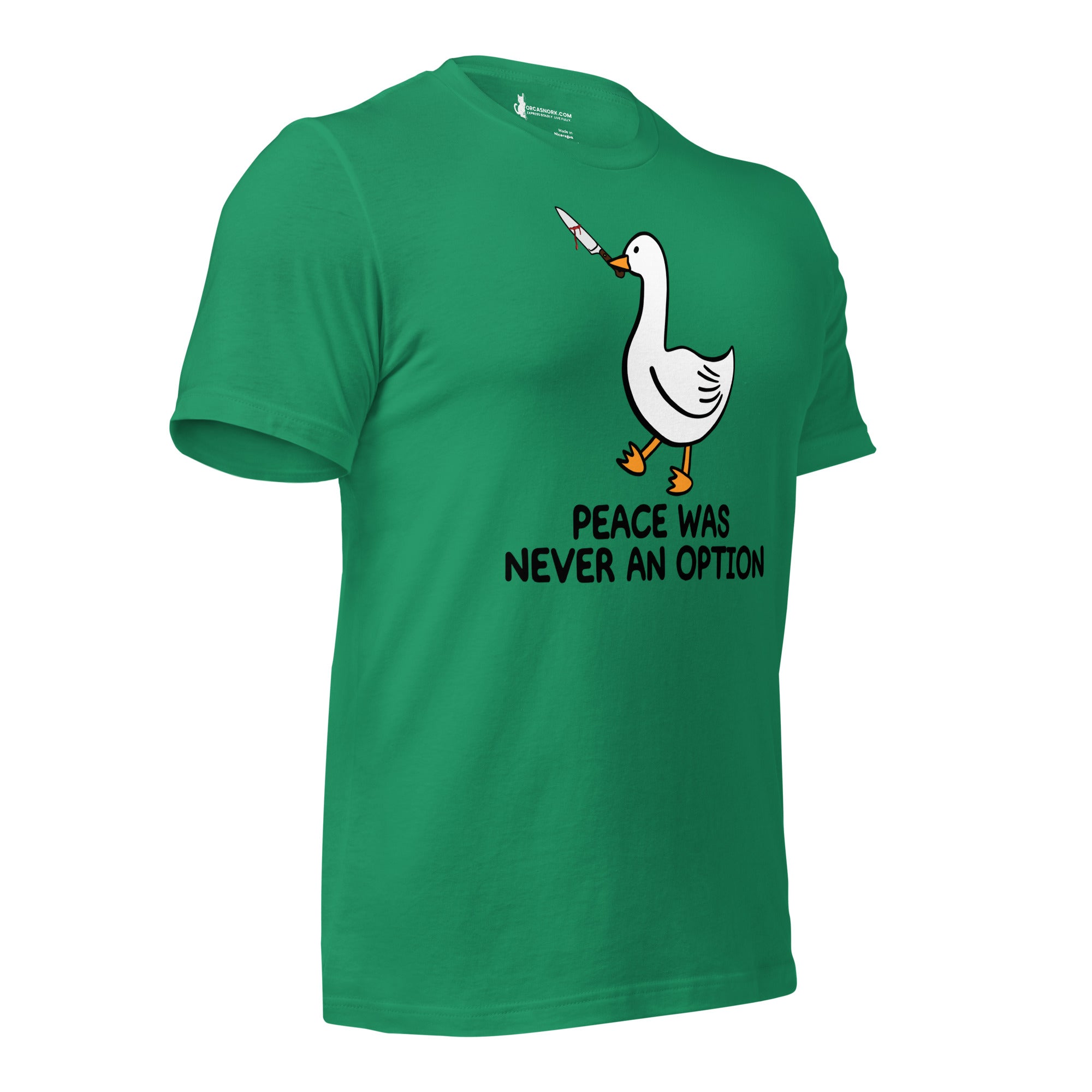 Tired of wearing basic tees that don't match your edgy sense of humor? Ready to trade in the ordinary for a viral internet meme classic that commands attention? Introducing the "Peace Was Never An Option" Funny Duck Men's Graphic T-Shirt—your new favorite piece for sparking conversation and showing off your rebellious side. Featuring a bold, clean-cut duck graphic with its iconic mischievous energy, this shirt is the ultimate way to display your bold personality and love for dark humor.