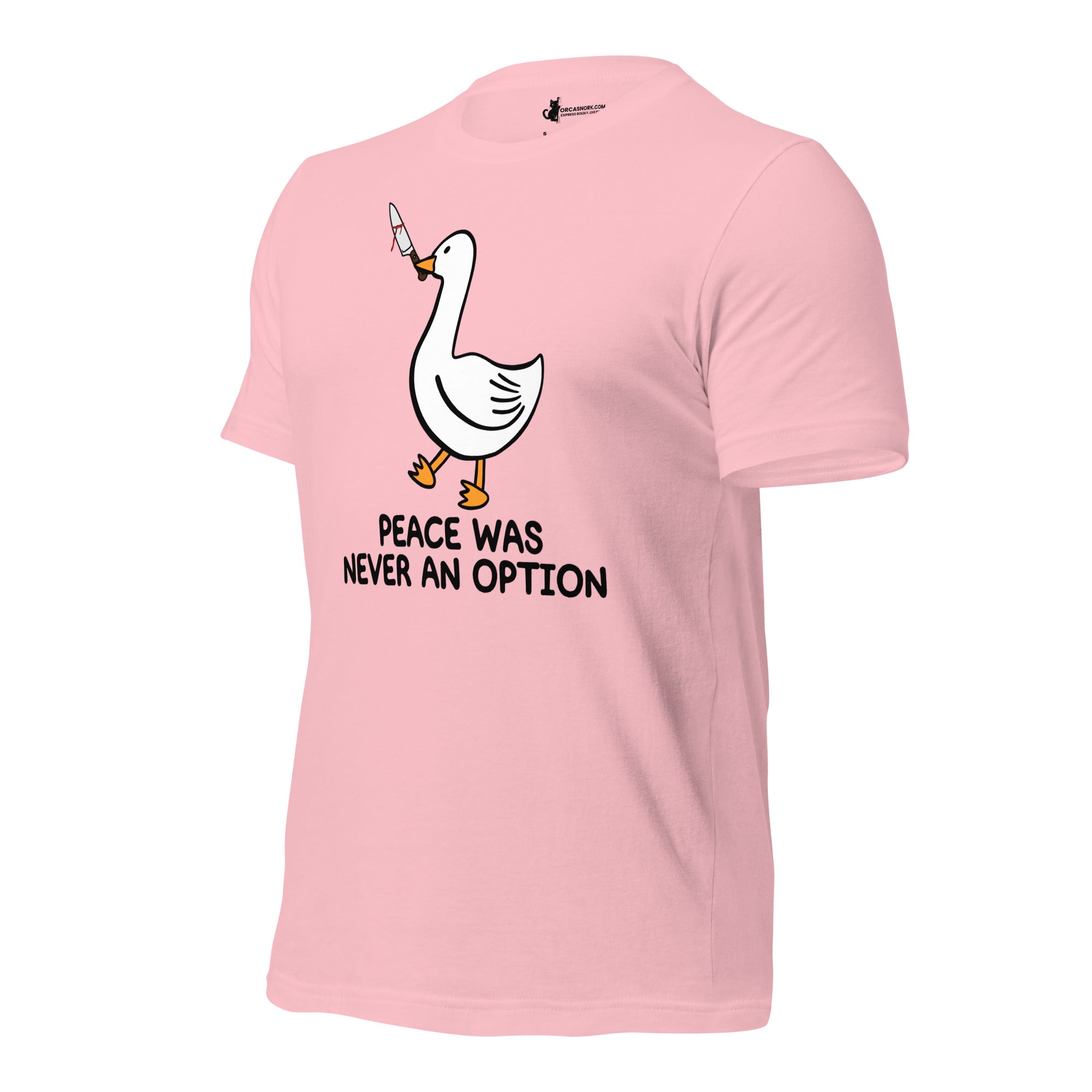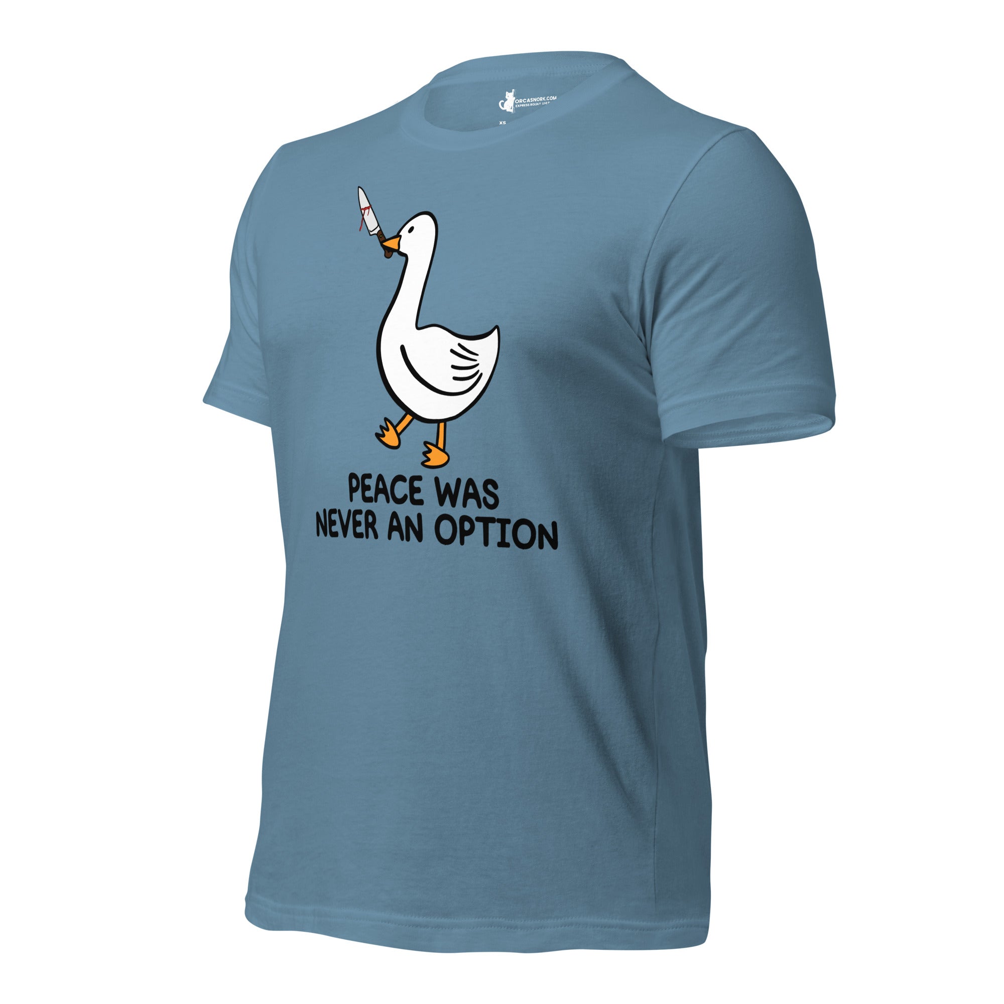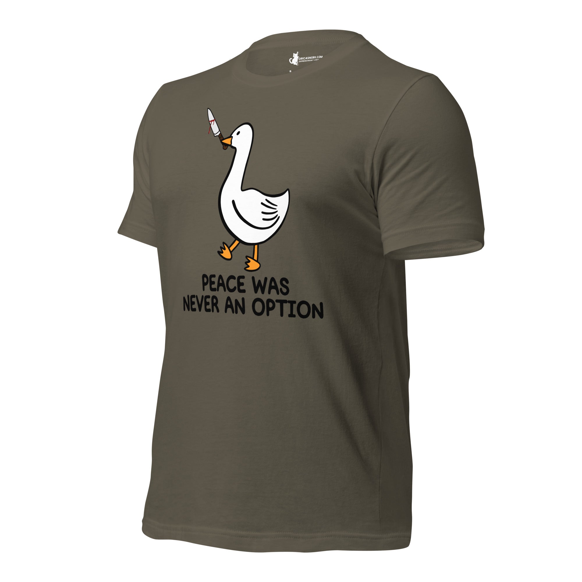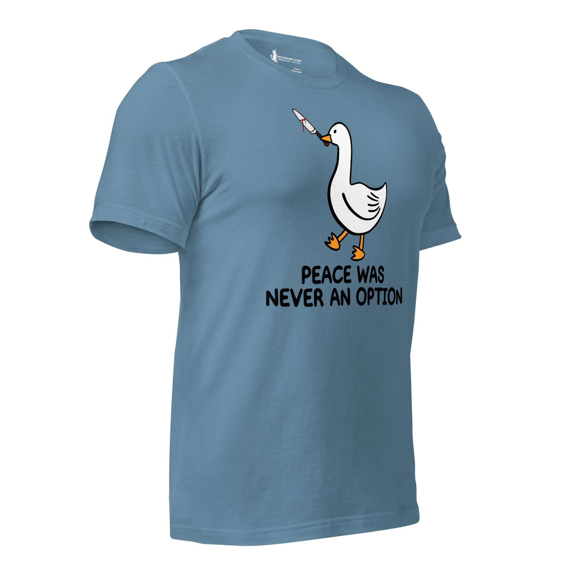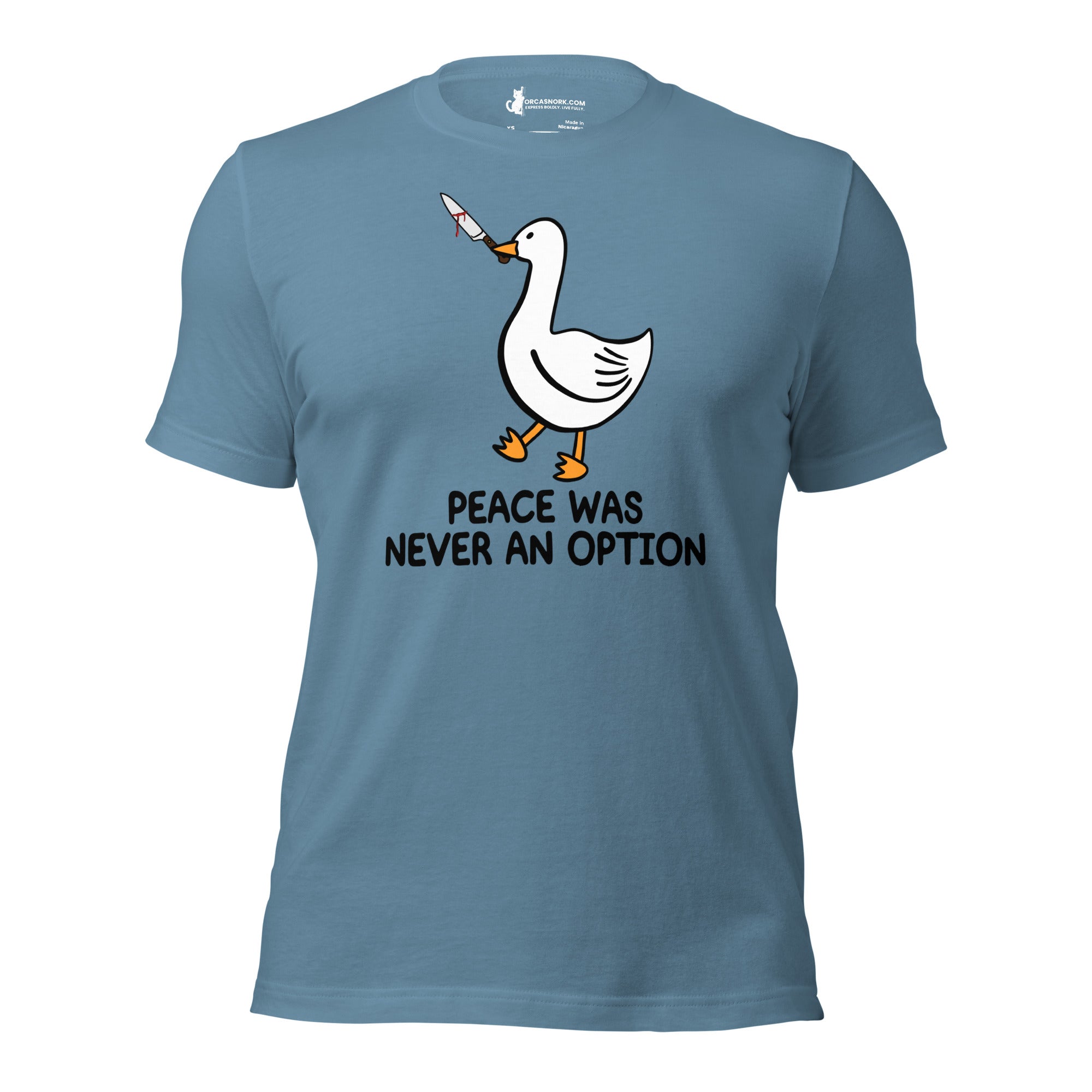 Tired of wearing basic tees that don't match your edgy sense of humor? Ready to trade in the ordinary for a viral internet meme classic that commands attention? Introducing the "Peace Was Never An Option" Funny Duck Men's Graphic T-Shirt—your new favorite piece for sparking conversation and showing off your rebellious side. Featuring a bold, clean-cut duck graphic with its iconic mischievous energy, this shirt is the ultimate way to display your bold personality and love for dark humor.